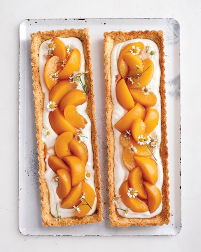 Filling: Stir together sour cream and sugar in a bowl and spread in bottom of crusts, dividing evenly. Remove peaches from liquid and blot dry. Dividing evenly, arrange peaches over filling; drizzle with reduced syrup. Serve immediately, topped with chamomile flowers.