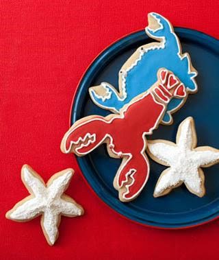 3. Divide icing into bowls. Tint some red, some blue and a tiny bit black (leave some white). Spread red icing on lobster, blue on crab and white on starfish. Sprinkle starfish with nonpareils and coarse sugar. Let cookies dry 1 hour.