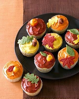 5. Decorate: Divide frosting into thirds. Tint each to desired shade with brown, green and yellow food colors. Spread frosting on cupcakes. Store cupcakes in refrigerator.Apples: Tint pieces of marzipan brown, green and yellow. Form the green and yellow marzipan into apple shapes. Form brown into apple stems; press into tops of apples. For red blush on yellow apples, dilute red food color with water. Apply with a small, clean artist's brush; let dry.