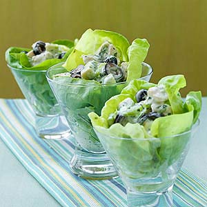 1. In a bowl, combine the chicken, celery, onion, avocado, olives, and chiles and stir until well blended. 2. In another bowl, whisk together the dressing, cilantro, parsley, lime juice, and cumin until emulsified. 3. Pour the dressing mixture over the chicken and toss until evenly coated. 4. Divide the mixture evenly between the lettuce cups.
