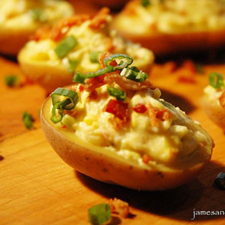With a spoon or small knife, fill the potatoes as you would deviled eggs (It does not work very well to pipe these, the salad is a bit to chunky).