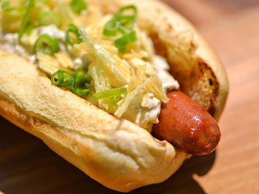 Having a lot of extra caramelized onions from the French onion dog, I used those leftovers to make a French onion dip. As I dunked my ruffled chips into that sweet and tangy dip, I couldn't help but think that this would be yet another great hot dog topping. So I slathered a mess of it onto a hot dog in a bun, then added crushed chips and green onions. I would have preferred chives over the green onions, but this still managed to be one mighty fine set of hot dog toppings, especially the chips, which added a nice salty crunch.