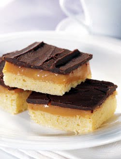 In a glass bowl set over a saucepan of simmering water, melt the chocolate. Once chocolate has melted, pour it over the cooled caramel layer. Cool at room temperature for about 10 minutes, and then place in the refrigerator to cool completely, allowing chocolate to slightly harden but not get hard.
