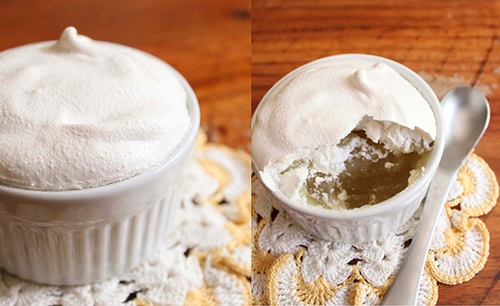 Spoon and scrape the applesauce into a baking dish or several individual-size baking dishes; I like to use a 2-quart Pyrex bowl or about 10 ½-cup ramekins. [You may have a tad bit of meringue left over.] Using a rubber spatula, scoop the meringue on top of the applesauce, and gently coax it evenly to the edges of the dish. Slide the dish or dishes into the oven, and bake for about 1 hour and 45 minutes, or until the meringue is firm and feels crisp and dry to the touch. Cool slightly. Serve warm or at room temperature.