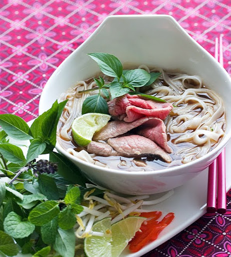 Ladling: Bring your broth back to a boil. Line up your soup bowls next to the stove. Fill each bowl with rice noodles, shredded cooked beef and raw meat slices. As soon as the broth comes back to a boil, ladle into each bowl. the hot broth will cook your raw beef slices. Serve immediately. Guests can garnish their own bowls as they wish.