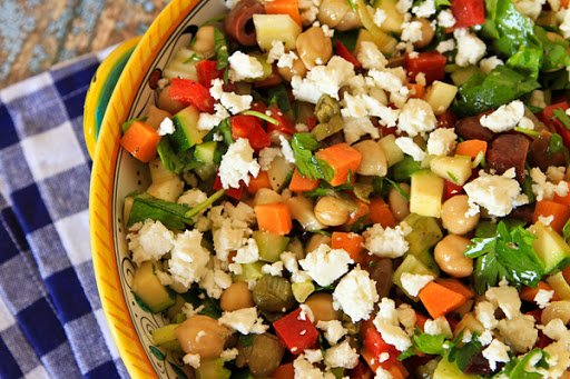 In a large bowl toss together the salad ingredients. In a small bowl, whisk together the dressing ingredients, then pour over the salad. Toss well to coat, taste, and adjust dressing ingredients, salt and pepper as needed. Sprinkle the Feta on top of the salad and serve.