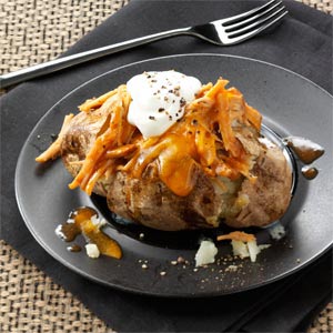 4) With a sharp knife, cut an "X" in each potato; fluff with a fork. Top each with butter and pork mixture; sprinkle with cheese. Top with sour cream.