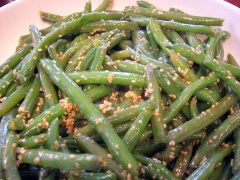 Heat a large nonstick skillet over high heat. Go once around the pan with your oil, add your sesame oil, and red pepper flakes. The pan will smoke. Add beans and stir fry for 2 minutes. Add sesame seeds and coars salt and toss to coat beans evenly.