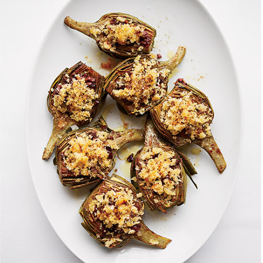 Lightly oil a ceramic baking dish. In a skillet, heat 1/2 cup of oil. Add the garlic and cook over moderately high heat until golden, 4 minutes; discard the garlic. Add the anchovies and stir until dissolved. Add the artichokes cut side down and cook until crusty on the bottom. Flip them and cook until lightly browned, 3 minutes; transfer the artichokes cut side up to the baking dish. Let the garlic-anchovy oil cool slightly.