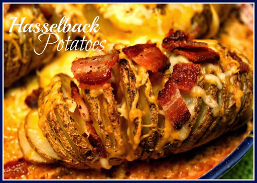 Cut the scrubbed potatoes across the tops in thin slices, not slicing completely through. You need a sharp knife to get good uniform slices. Leave about 1/8 inch intact on the bottom to hold them together. Place on a baking dish or cookie sheet. Drizzle each one with olive oil, fanning the slices apart a little so it gets down between the cuts. Cut the butter in small pieces and stuff it in between the cuts. Sprinkle with salt, black pepper and just a little garlic powder. Place in the oven and bake for 1 hour.