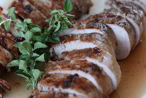 Remove the tenderloins from the marinade and discard the marinade but leave the herbs that cling to the meat. Sprinkle the tenderloins generously with salt and pepper. Heat 3 tablespoons olive oil in a large oven-proof saute pan over medium-high heat. Sear the pork tenderloins on all sides until golden brown. Place the saute pan in the oven and roast the tenderloins for 10 to 15 minutes or until the meat registers 137 degrees F at the thickest part. Transfer the tenderloins to a platter and cover tightly with aluminum foil. Allow to rest for 10 minutes. Carve in 1/2-inch-thick diagonal slices. The thickest part of the tenderloin will be quite pink (it's just fine!) and the thinnest part will be well done. Season with salt and pepper and serve warm, or at room temperature with the juices that collect in the platter.