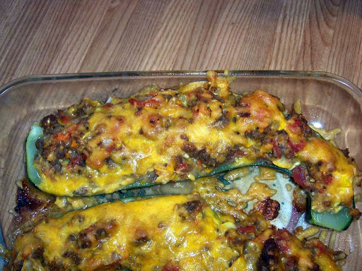 Place zucchini shells on a baking dish and fill with the sausage stuffing. Sprinkle with cheese. Bake at 350 for about 25 minutes until the cheese begins to brown.