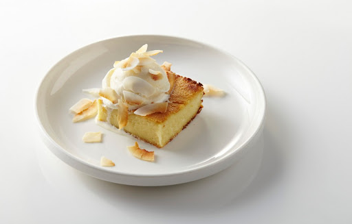 Bake cake until golden brown and a tester inserted into the center comes out clean, 45–50 minutes. Transfer dish to a wire rack. Brush cake with remaining 1 Tbsp. butter; let cool slightly. Serve with coconut ice cream, topped with coconut flakes.