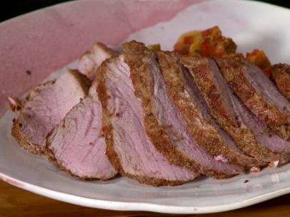 Remove the pork from the oven and let rest for 10 minutes before carving. Slice the pork into 1/2-inch thick slices on the bias.