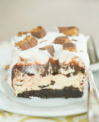 1. Make the Crust: Place the cookies in a food processor blender and process until they are broken down into fine crumbs. Add the melted butter and pulse a few times to ensure that all of the crumbs are evenly moistened. Turn the crumbs out into a 9x13-inch pan and press into an even layer. Refrigerate while the peanut butter layer is prepared.