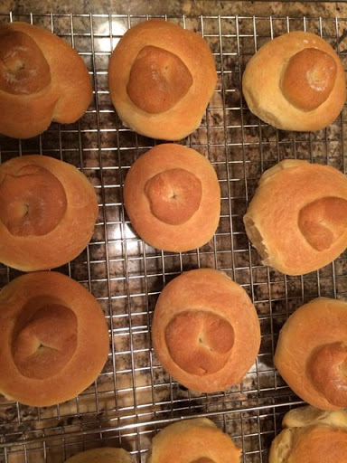 Dissolve warm water, yeast, and sugar. Add 3/4 cup flour to make a sponge. Stir well. Let stand until double. Melt butter in saucepan, remove from heat. Gradually whisk in milk. Pour into large missing bowl and cool just enough to not harm the yeast. Add sponge and salt. Stir well. Gradually add the 6-7 cups of flour (or as much as is needed), eventually kneading the dough to make a soft dough. When all the flour is added, check dough for stickiness. Kneed in more flour to make dough soft, not sticky. Put dough in a greased bowl and cover with plastic wrap. Let rise until double. Punch dough down. To make rolls: Pinch small piece of dough through thumb and index fingers, and place on lightly greased cookie sheet. Pinch off smaller piece and place on top. With floured index finger, push finger through both balls of dough all the way to the pan. Cover with dish towel and let rise/rest for 20-30 min more. Bake in a 350 to 375 degree oven for 25 to 30 minutes. These can be enjoyed plain, with cheese, or with jelly. Yields approximately 3 dozen.