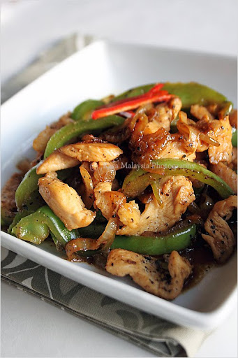 Heat up a wok and add cooking oil. When the cooking oil is hot, add the sliced onions and quickly stir-fry until aromatic and follow by the bell pepper and black pepper. Stir-fry for 1 minute and add in the chicken strips. Continue to stir-fry until the chicken is cooked. Add in soy sauce, Maggi sauce, sugar, and continue to stir-fry until the onions are caramelized. Dish out and serve hot.