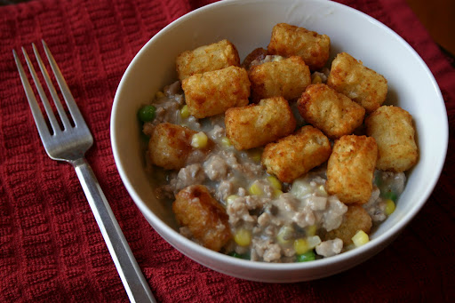 Top mixture with Tater Tots. Sprinkle with Cheddar cheese and cover until melted, about 1 minute.