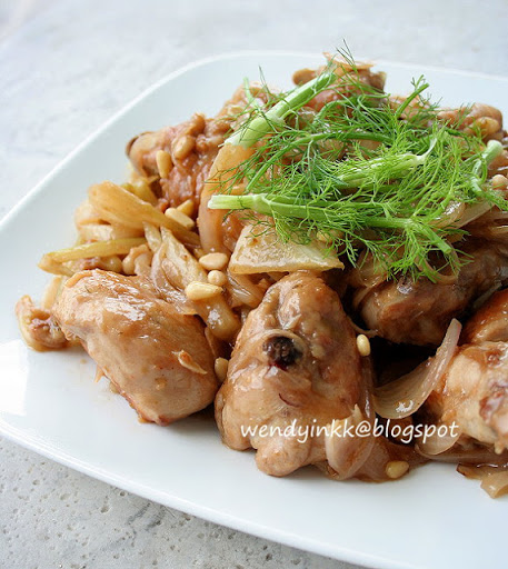 6. Return browned chicken pieces back to wok and put in 1 cup of water. Cook on medium heat until gravy dries up and fennel is soft. Put in pine nuts.