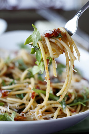 4. Transfer pasta to frying pan and gently toss the pasta and sauce to combine. Add a splash or two of the cooking water if necessary to loosen the sauce. Add arugula by the handful and continue to toss for a minute or two until the greens are slightly wilted.