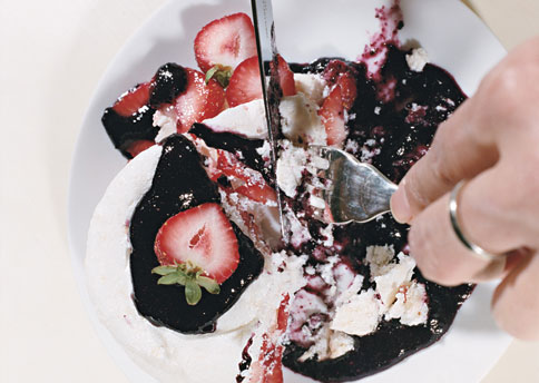 A light, crispy French-style macaroon is the base for this dessert. Huckleberries and strawberries are a great combination, but feel free to use the berries that look best at the market.