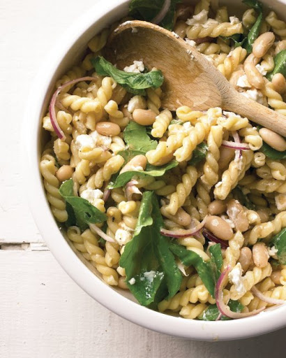 In a large pot of boiling salted water, cook pasta until al dente. Drain pasta and rinse under cold water. In a large bowl, toss pasta with beans and goat cheese.