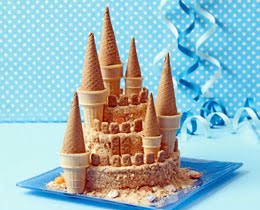 Use a rolling pin or food processor to crumble the wafers. With your hands, press the crumbs into the frosting, completely coating the cake. Spread frosting on the bottom of each ice-cream cup, then set them around the cake. With a serrated knife, carefully trim 1 1/2 inches from the top of 2 of the sugar cones. Set all 6 cones into the cups to complete the turrets, spreading a bit of frosting around the rims to hold them if needed.