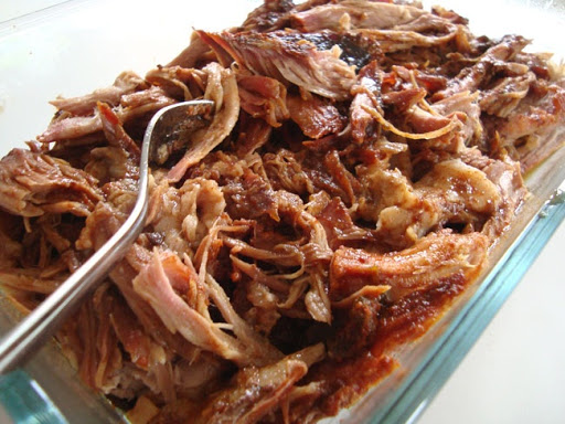 Place on a large, clean work surface such as a cutting board, and remove the large sheet of crusted fat on the top. Pull apart with two forks, it will pull apart very easily. Add some of the cooking liquid back to the pulled pork, along with a little barbeque sauce, if desired. I also added a few tablespoons of the dry rub to the pulled pork and mixed well before serving.