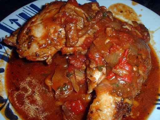 place browned chicken in slow cooker. dump in spaghetti sauce onions mushrooms and green peppers. salt and pepper to taste. cook on low for 7 - 9 hours in crock pot