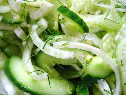 Fennel bulbs are licorice-flavored vegetables that are at their prime during the fall and winter months. Fennel bulbs can be roasted, grilled, sauteed or eaten raw. Here, they are shaved paper-thin using a mandoline, then toss with cucumbers, capers, lemon and olive oil.