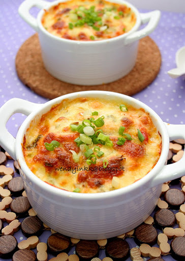 8. Top rice with béchamel sauce. Then arrange prawns on top of sauce. Then sprinkle spring onions and finally the mozzarella cheese, as much as you like.