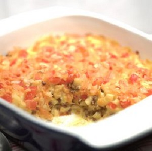 Top with beef mixture. Spread remaining package macaroni and cheese over beef mixture; top with tomato, potato chips and cheese.