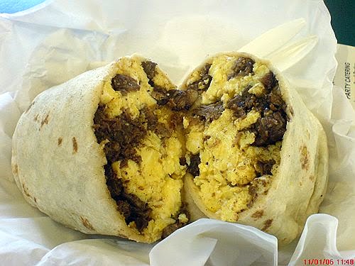 Lay out a tortilla, add a small slice of cheese, a small scoop of egg, and a small scoop of whatever else you are adding, a slice of bacon, etc… Don’t try to over stuff the tortillas or they will rip or leak and you won’t have your handy portable breakfast.