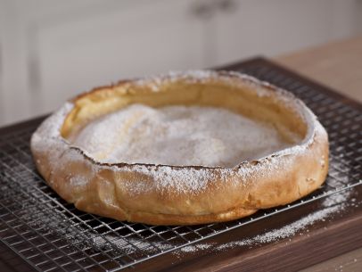 Using a spatula, remove the entire Dutch baby from the pan and place on a cooling rack for a few minutes to allow the steam to escape without condensing along the bottom and rendering the pancake soggy. Dust with confectioners' sugar when cooled slightly. Slice the pancake into 8 wedges on a serving platter or cutting board