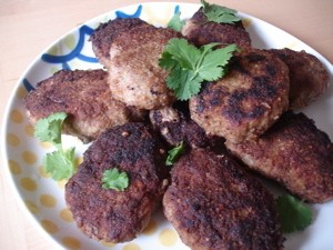 2. Using damp hands, shap the meat mixture into lumps the size of eggs. Flatten them into oval patties and roll them in flour or bread crumbs. Brown the patties on both sides in a skillet in 1/2 cup hot oil over medium heat. Add more oil if necessary.