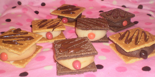 Now gently squeeze each ball between a pair of graham crackers. Melt the chocolate chips (either in a microwave in 30 second increments or in a double boiler). Transfer to a ziploc bag, cut off the corner (as small as you can manage) and pipe some nice zigzaggy flourishes on top of each sandwich. Finally, complete each mammary with its own M&M nipple, using shades of pink and tan and brown as you please.