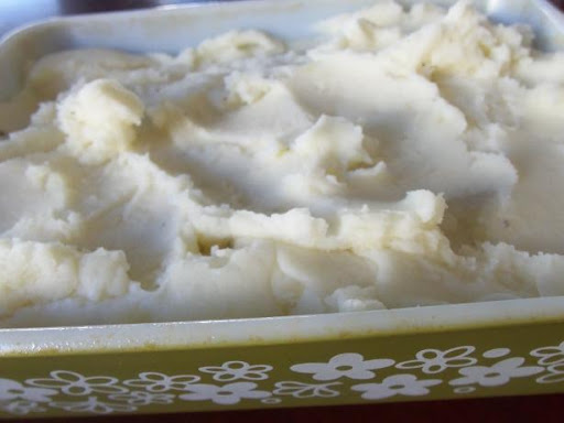 3 Spread mashed potatoes into a greased baking dish. If you like, slice 1/4 cup butter into pats and place on top of the poatatoes. Cover the dish.