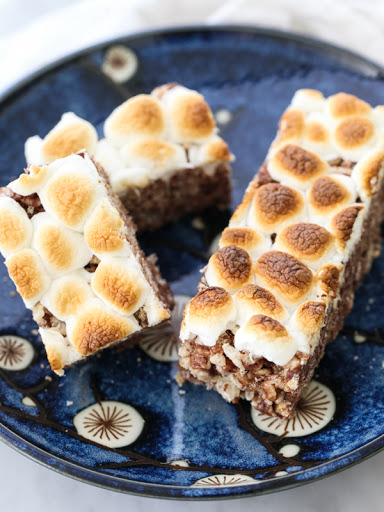 Butter fingers and press the cereal into the prepared pan. Top with 2 cups of remaining mini marshmallows and broil for 5 minutes or until lightly browned.