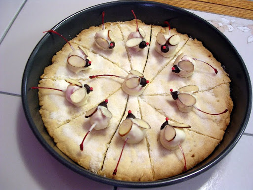 In large bowl mix first 6 ingredients with mixer a medium speed, scraping bowl occasionally. Pat dough into a 9 inch round pan. Prick the dough with a fork all over. With spoon sprinkle sugar over the top. Bake 30 to 35 minutes. When still warm cut into wedges.
