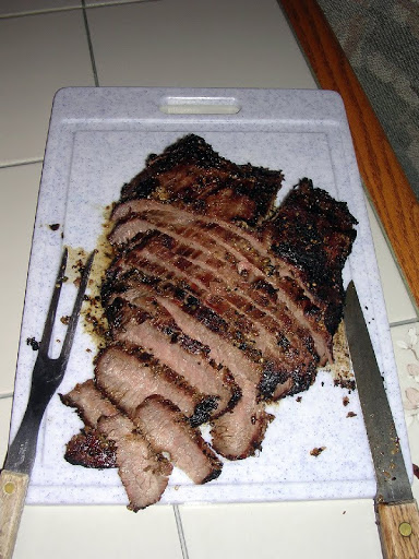 Lift steak from marinade and drain. Reserve marinade. Place on a lightly greased grill over hot coals. Cook turning once and baste with reserved marinade. Grill to your liking. To serve let steak stand 5 min, cut across the grain into thin slanting slices.