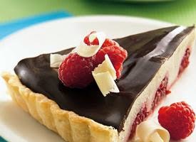 5. In 1-quart saucepan, melt semisweet chocolate and butter over low heat, stirring frequently; carefully pour and spread over white chocolate layer. Refrigerate at least 2 hours until set. To serve, let stand at room temperature about 30 minutes to soften chocolate layers. Cover and refrigerate any remaining tart. Garnish each slice with fresh raspberries and white chocolate curls.