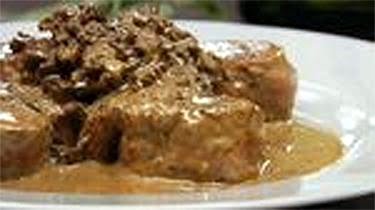Medallions of pork tenderloin are pan fried until tender and golden. They are smothered with a rich morel cream sauce that has a hint of Calvados.