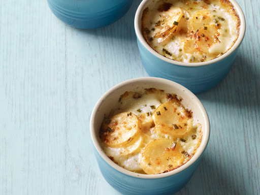 Transfer the ramekins to a baking sheet, cover each with foil and bake until the liquid is bubbly and the potatoes begin to soften but are not completely cooked through, about 40 minutes. Increase the oven temperature to 425 degrees F, uncover the ramekins and bake until the potatoes are tender and golden brown, 15 to 20 minutes. Run a knife around the edges and let stand 10 minutes before serving.