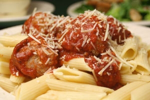 Mix it all together. Combine pasta and spinach sauce together in baking dish. Nestle in the meatballs, top with cheese and put back into oven until bubbling (about 10 minutes).