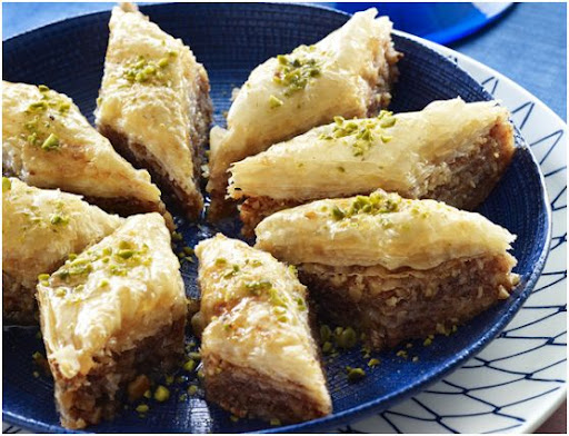 Trim the sheets of phyllo to fit the bottom of a 13 by 9 by 2-inch metal pan. Brush the bottom and sides of the pan with butter; lay down a sheet of phyllo and brush with butter. Repeat this step 9 more times for a total of 10 sheets of phyllo. Top with 1/3 of the nut mixture and spread thinly. Spritz thoroughly with the rose water. Layer 6 more sheets of phyllo with butter in between each of them, followed by another third of the nuts and spritz with rose water. Repeat with another 6 sheets of phyllo, butter, remaining nuts, and rose water. Top with 8 sheets of phyllo brushing with butter in between each sheet. Brush the top generously with butter. Place in the oven and bake for 30 minutes. Remove pan from the oven and cut into 28 squares. Return pan to the oven and continue to bake for another 30 minutes. Remove pan from the oven, place on a cooling rack, and cool for 2 hours before adding the syrup.