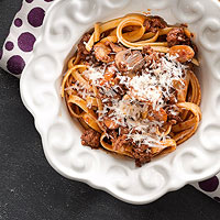 Cook pasta until al dente; drain, reserving 1 cup pasta cooking water. Meanwhile, in large skillet, cook mushrooms and garlic in butter over medium-high until browned, 5 minutes. Add beef; cook until browned, 5 minutes. Add wine and tomato paste; simmer 5 minutes. Add pasta and reserved cooking liquid; toss to coat. Top with Parmesan.