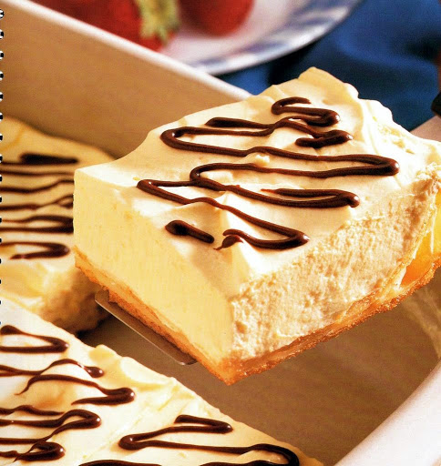 4. For topping, place chocolate and remaining whipped topping in small micro cooker. Microwave, uncovered on high for 30-40 seconds; stir until smooth. Pour chocolate mixture into small resealable plastic bag. Close bag. Cut dessert into 15 squares. Cut off very tip of one corner of the plastic bag with kitchen shears. Garnish with a drizzle of chocolate. Refrigerate until ready to serve or serve right away.