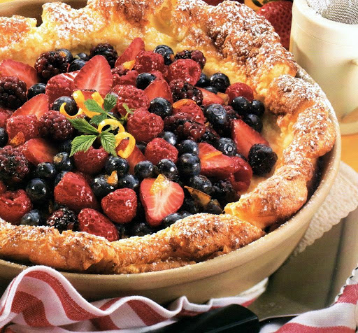 Preheat over to 450° F. For berry topping, gently stir together berries and marmalade; set aside. For pancake, use a pastry brush to coat a deep dish baker with butter.