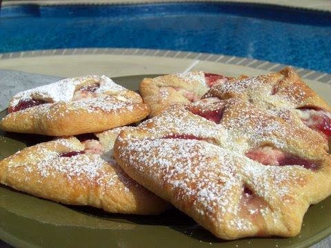 Preheat oven to 375. On a cookie sheet, separate dough into 4 rectangles; pinch diagonal seams closed; sprinkle with 1 tablespoon confectioners sugar. Spoon 1/4 cream cheese and 1/4 preserves in center of each. Brush edges with egg whites. Fold corners to center; press. Brush tops with egg whites. Bake 15 to 20 minutes until golden. Sprinkle with confectioners sugar. Best eaten warm.