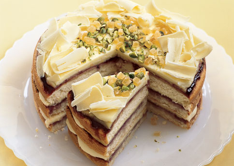 Garnish top edge of cake with white chocolate curls. Sprinkle pistachios and crystallized ginger in center of cake.